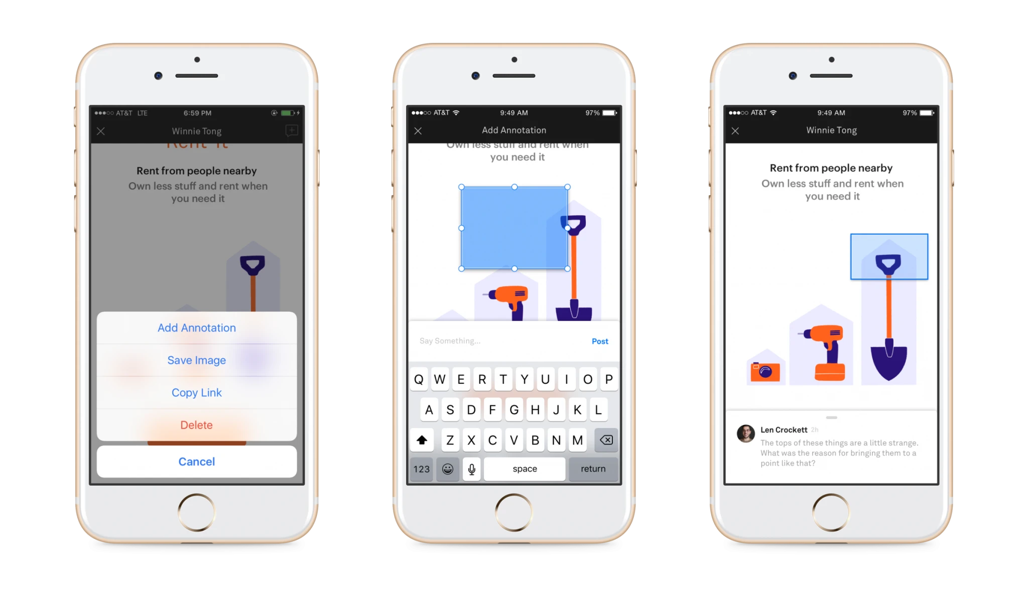 Create: Click/tap on the canvas to drop a pin, type a comment, hit return.